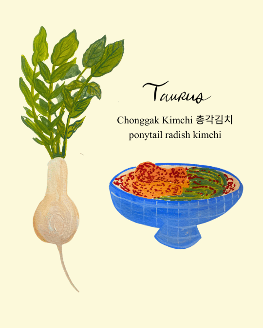 Like a Taurus, chonggak kimchi is grounded, earthy, comforting, and luxurious. Chonggak kimchi is called a “rice thief” for being so delicious, that so much rice is consumed with it!