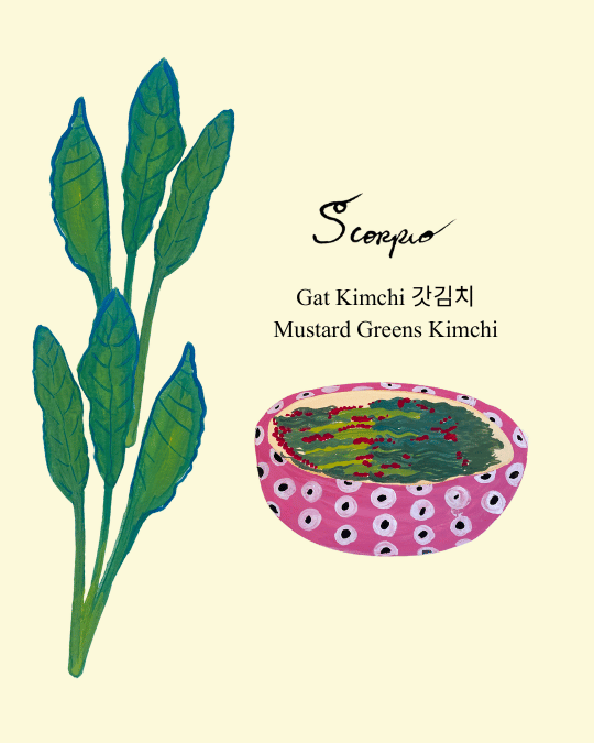 Gat Kimchi has a sharp, nose-tingling taste lent directly from the mustard leaves themselves which is the principal ingredient of this type of kimchi. When preparing this type of kimchi, we usually do not add any other vegetables like radish or scallions so that we can simply enjoy its unique taste and flavor. Scorpios are equally intense, sharp (you can never fool a Scorpio) and never, ever boring!