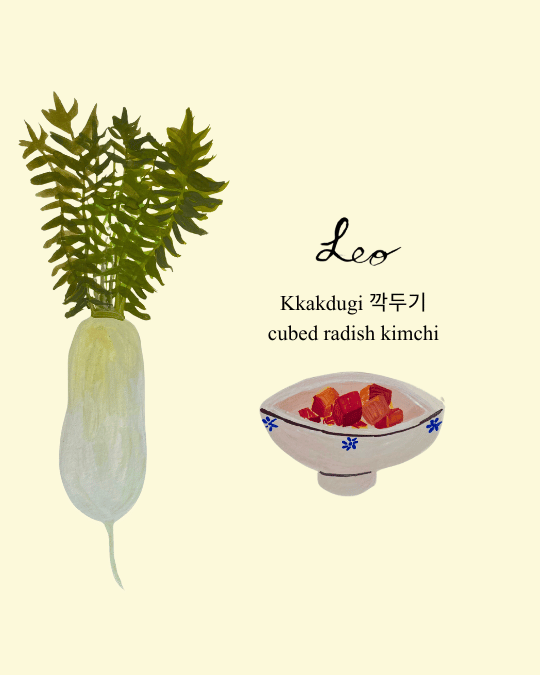 Kkakdugi is an immensely popular dish in Korea. The story goes that it was created for King Jeongjo of the Joseon Dynasty in the 18th century. The principal ingredient in this dish is the Korean radish (mu) which is chopped into bite-size cubes and then mixed with kimchi paste and fermented for a week. It is most commonly eaten with warm and hearty soups and stews like seollangtang (ox tail soup) and galbi-tang (short rib soup). This is why we think this kimchi fits a Leo’s persona perfectly – they are warm, royal, and generous.